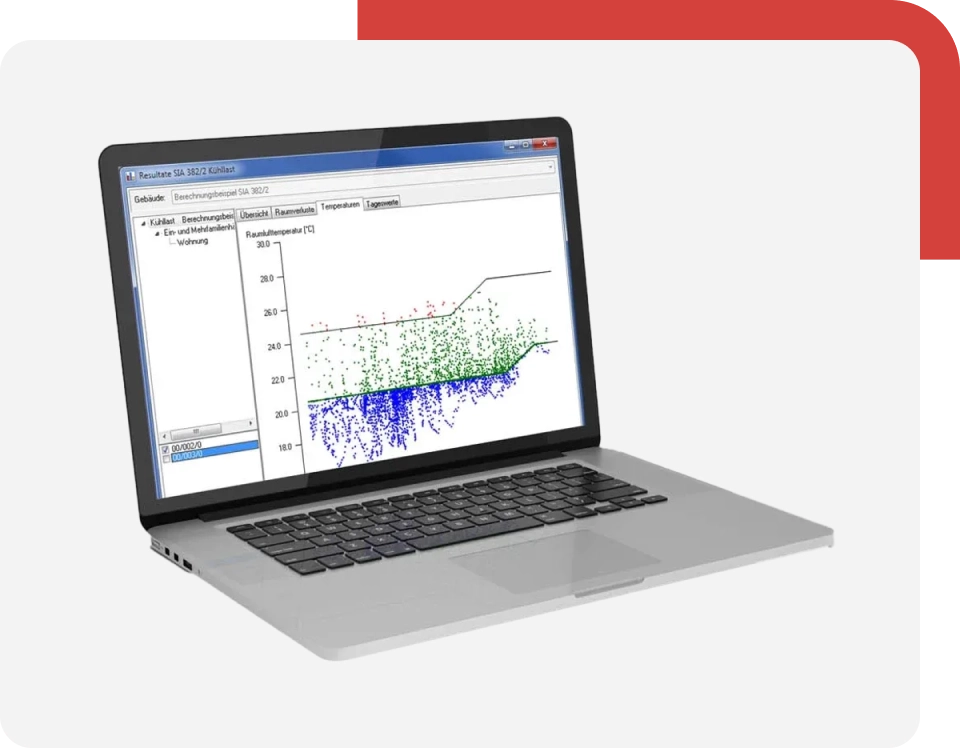 Die numerischen und grafischen Resultate der Raumtemperatur-Simulation geben Ihnen Aufschluss, inwieweit die Anbringung von Isolationen, Spezialglas, Sonnenschutz, das Arbeits- oder Wohngefühl verbessern kann, bei Bedarf auch ohne Einsatz von Kühlsystemen.